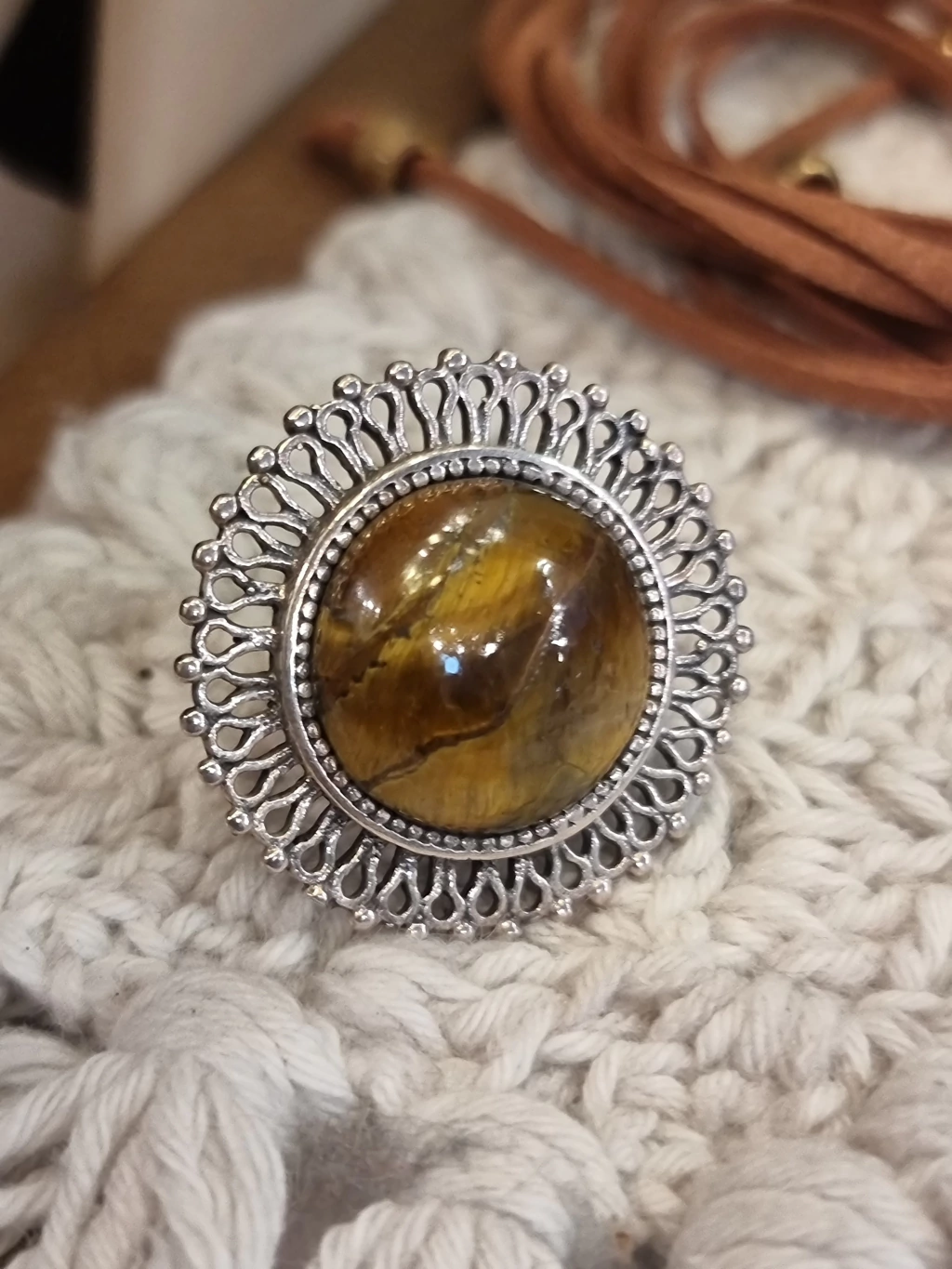Anillo confeccionado en bronce con baño de plata y piedra natural (Ojo de tigre), diseñado en India.