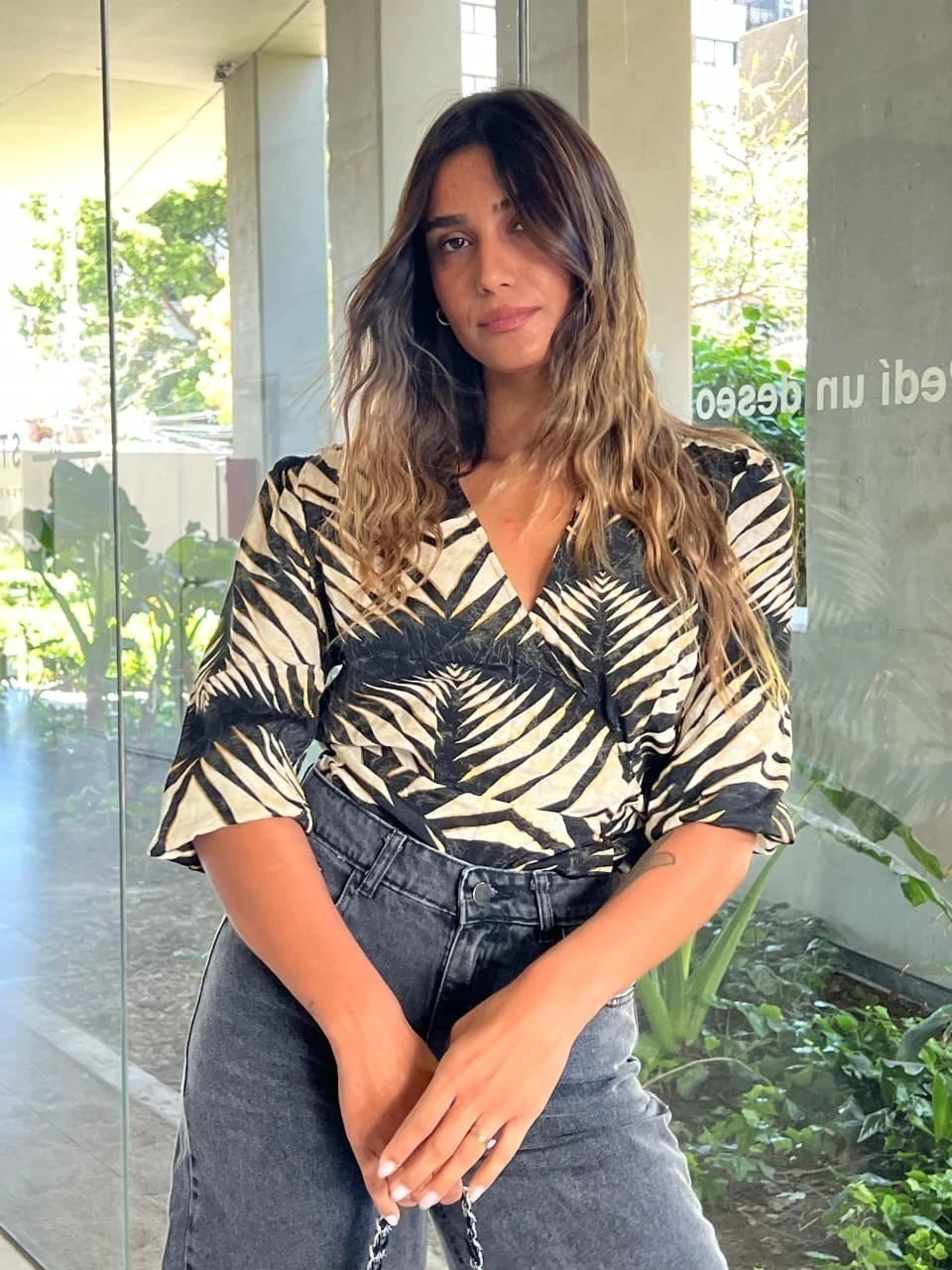 Nuestra blusa capri se ata a un costado, dando la imagen de blusa cruzada. Posee mangas largas y está confeccionado en gold saree. Talle S/M y M/L.