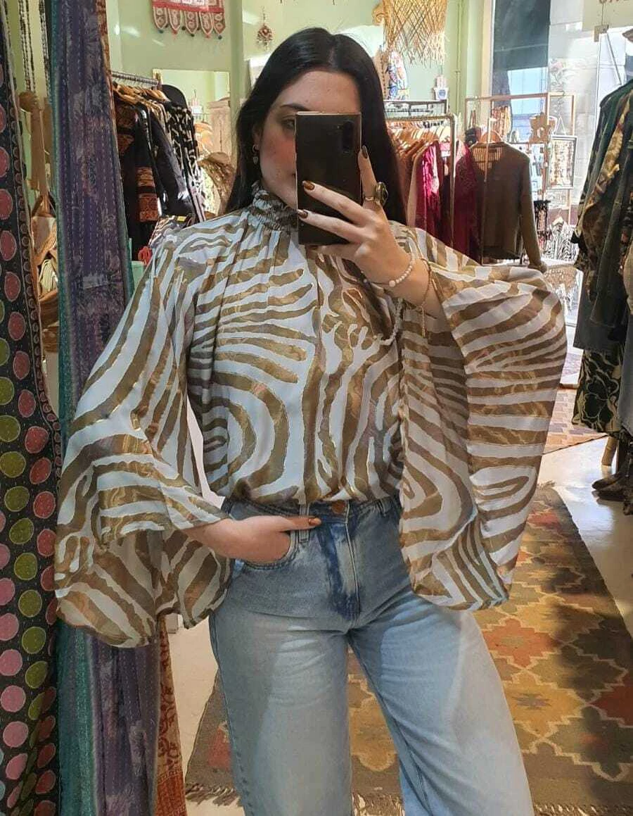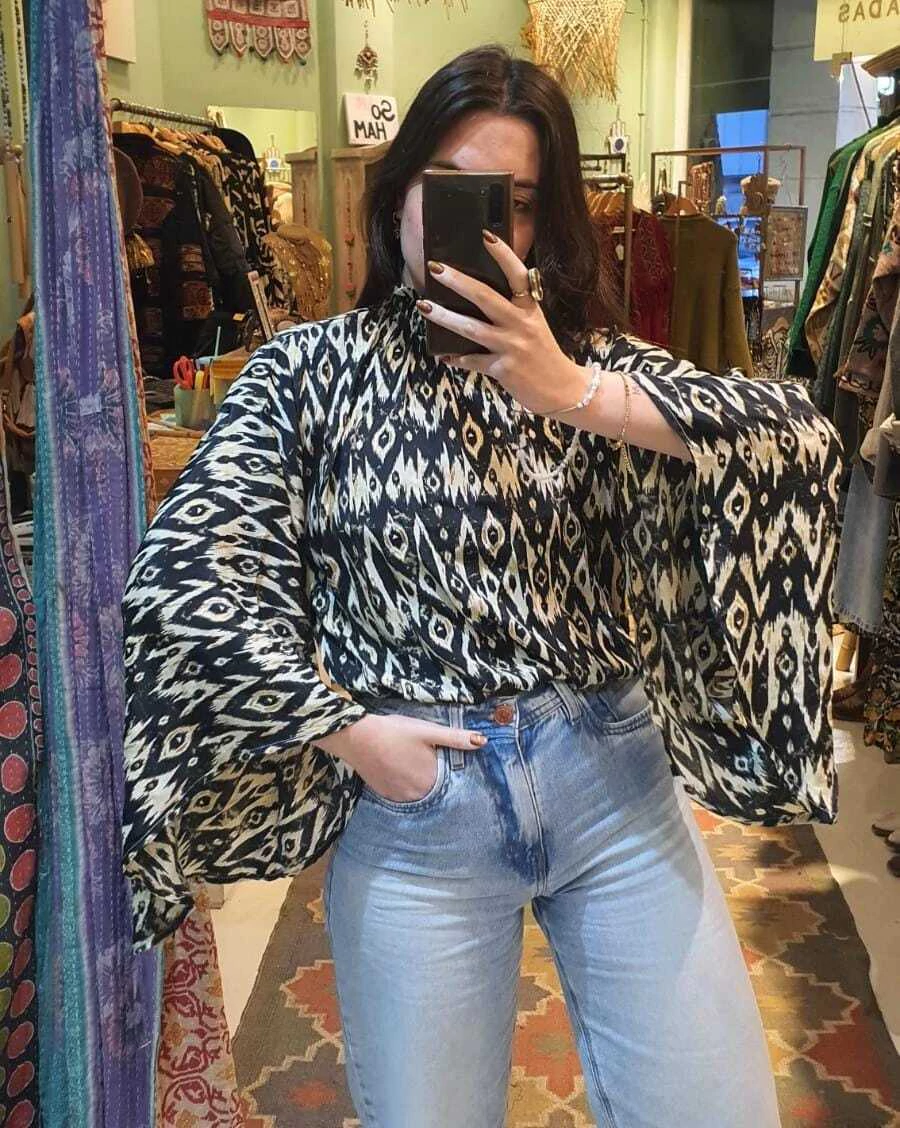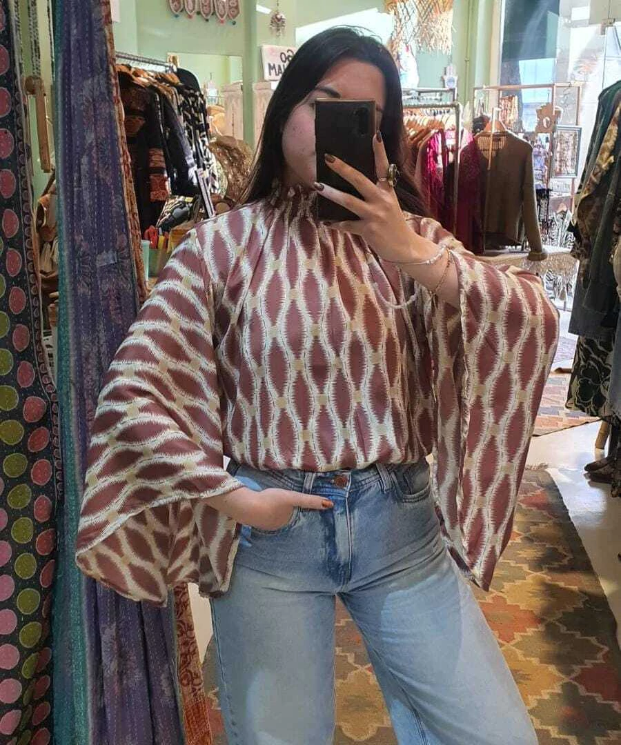 Nuestra blusa Meredith hecha en India, de seda gooldsaree, se destaca por su cuello button, los botones en la parte delantera del cuello ayudan a mantenerlo en su lugar para mayor prolijidad. Sus mangas obispo la hacen una prenda sofisticada.