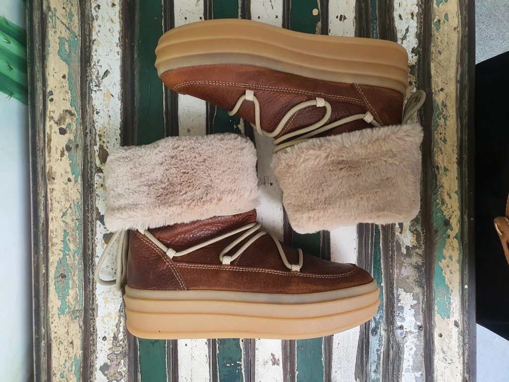 Botas de cuero forradas en  corderito, posee una base de goma autodeslizante de 4cm. Super cómodas y calentitas!!