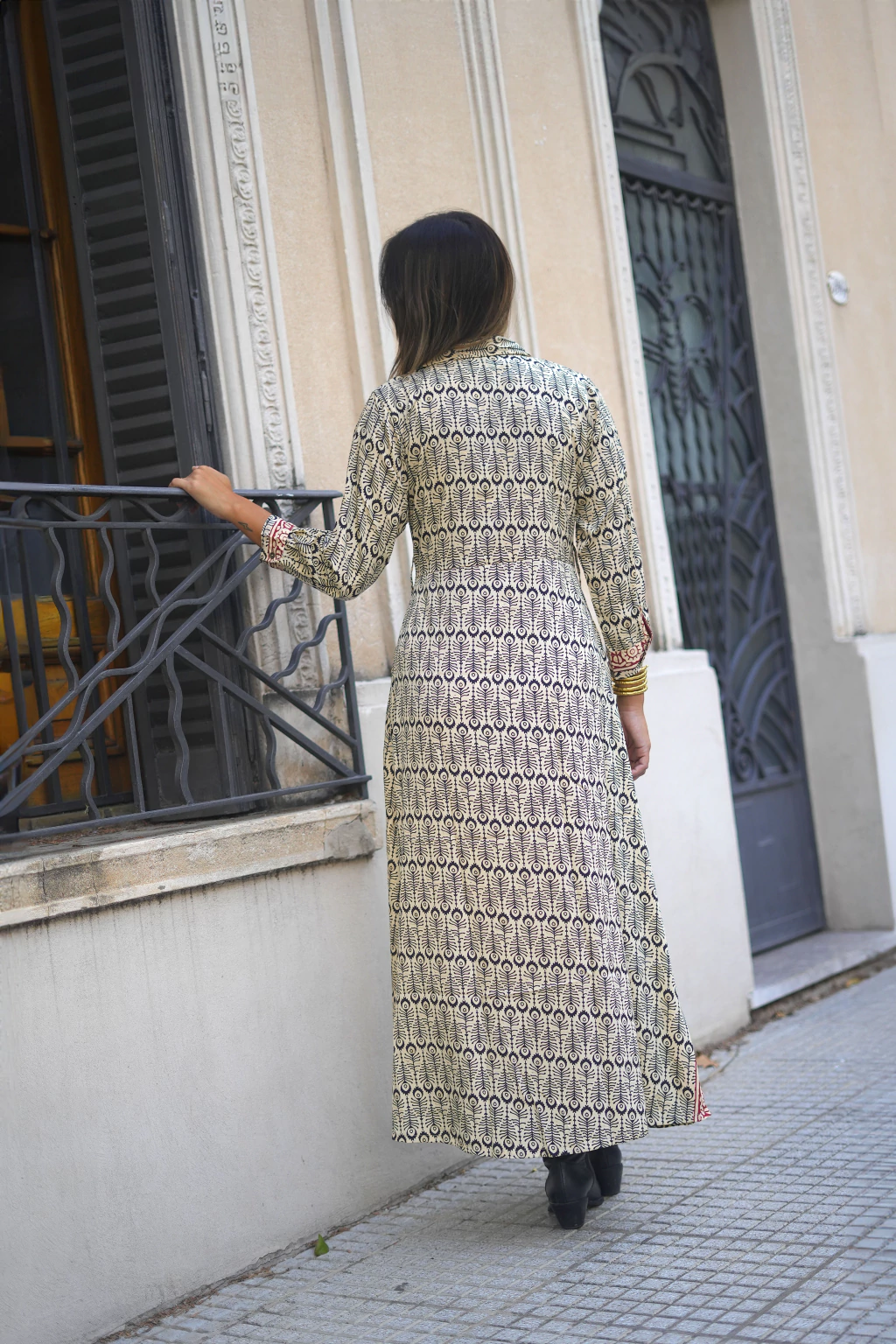 Camisero largo confeccionado con la tecnica de sellado Block Print, el modelo Apollo mangas largas, tiene botones delanteros en todo su largo, tambien posee un lazo para cruzar en la cintura y bolsillos invisibles. Super comodo y versatíl ya que tambien lo podes usar como kimono. Disponible en 3 tonos!!