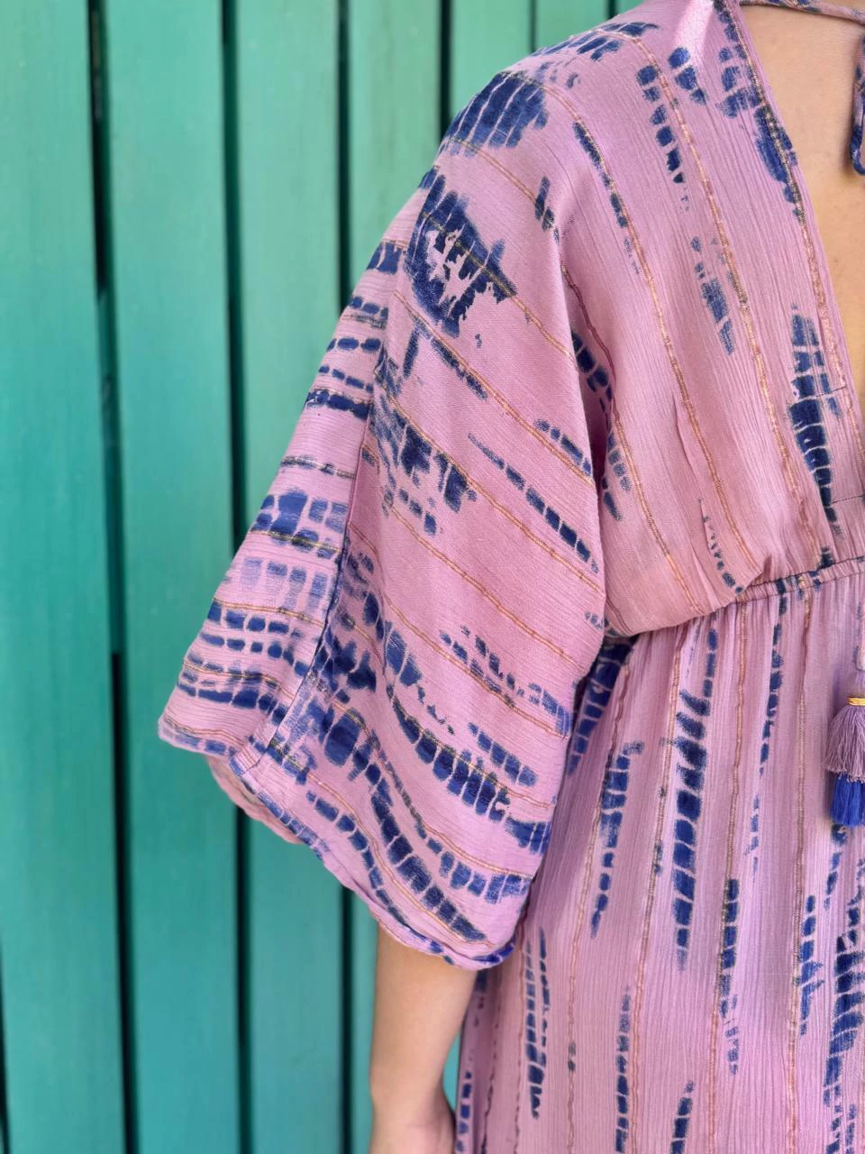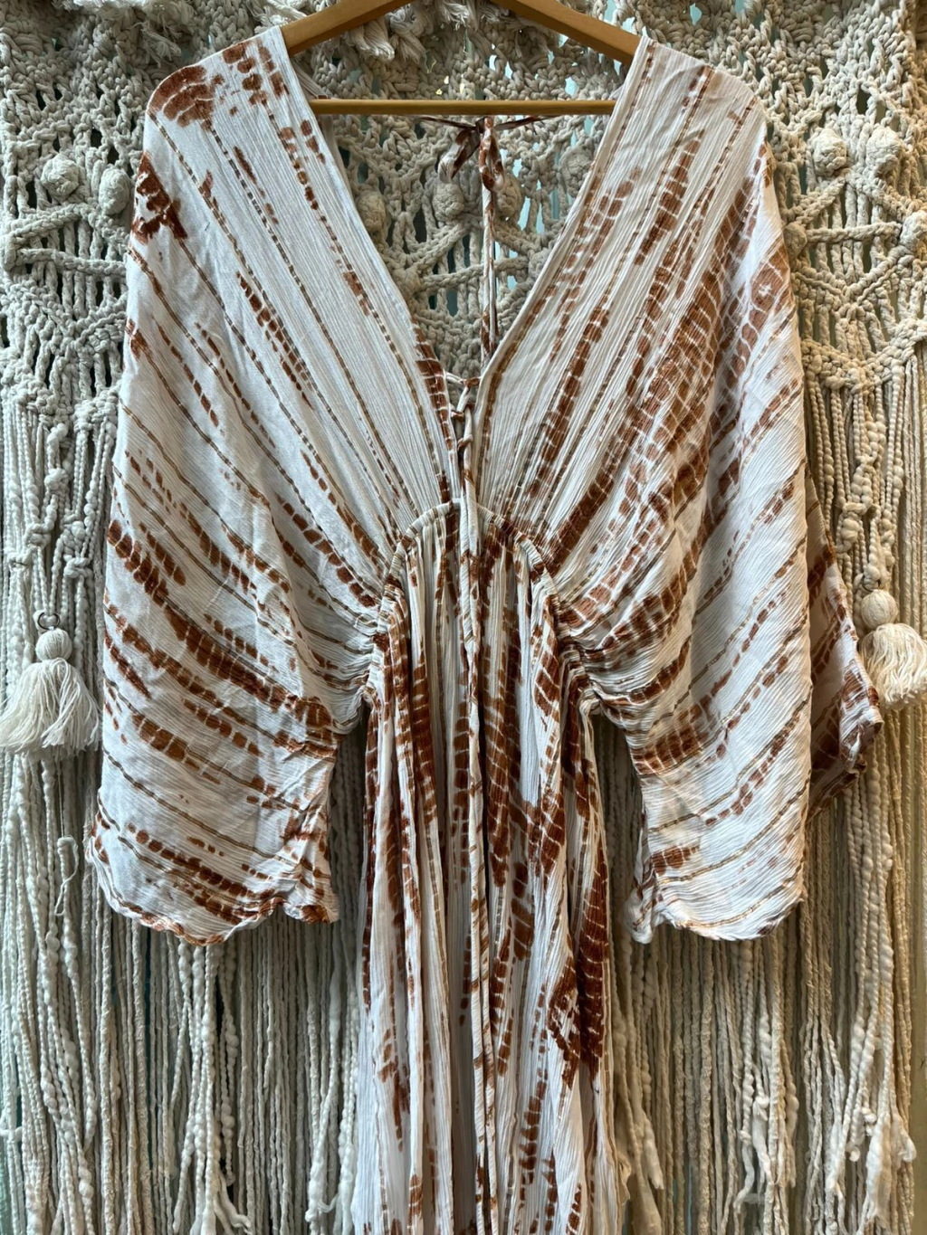 El Kaftan Susurro Antiguo es una prenda impresionante, diseñada para destacar con elegancia y fluidez. Con un delicado escote en V tanto en el frente como en la espalda, de donde parten dos lazos adornados con borlas, este kaftan captura un estilo sofisticado y relajado. Sus mangas amplias y el corte justo por debajo del busto realzan la figura de manera sutil, mientras que los dos tajos laterales añaden libertad de movimiento y un toque sensual. Ideal para cualquier ocasión donde quieras irradiar comodidad y glamour.