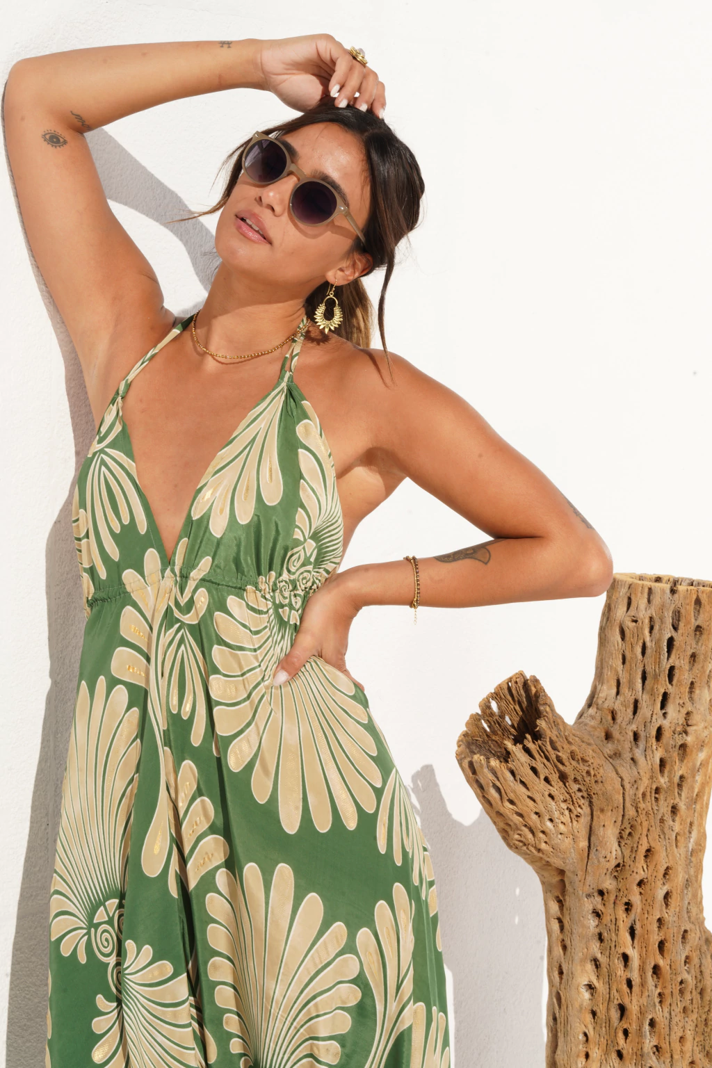 Mono largo escote V, con espalda descubierta y lazos que se atan en la parte de atrás donde parten dos lazos adornados con borlas.
