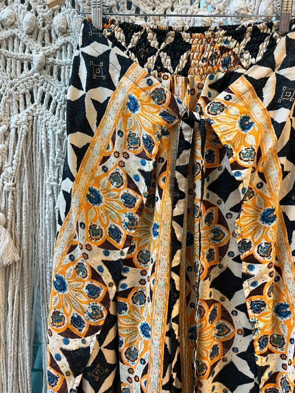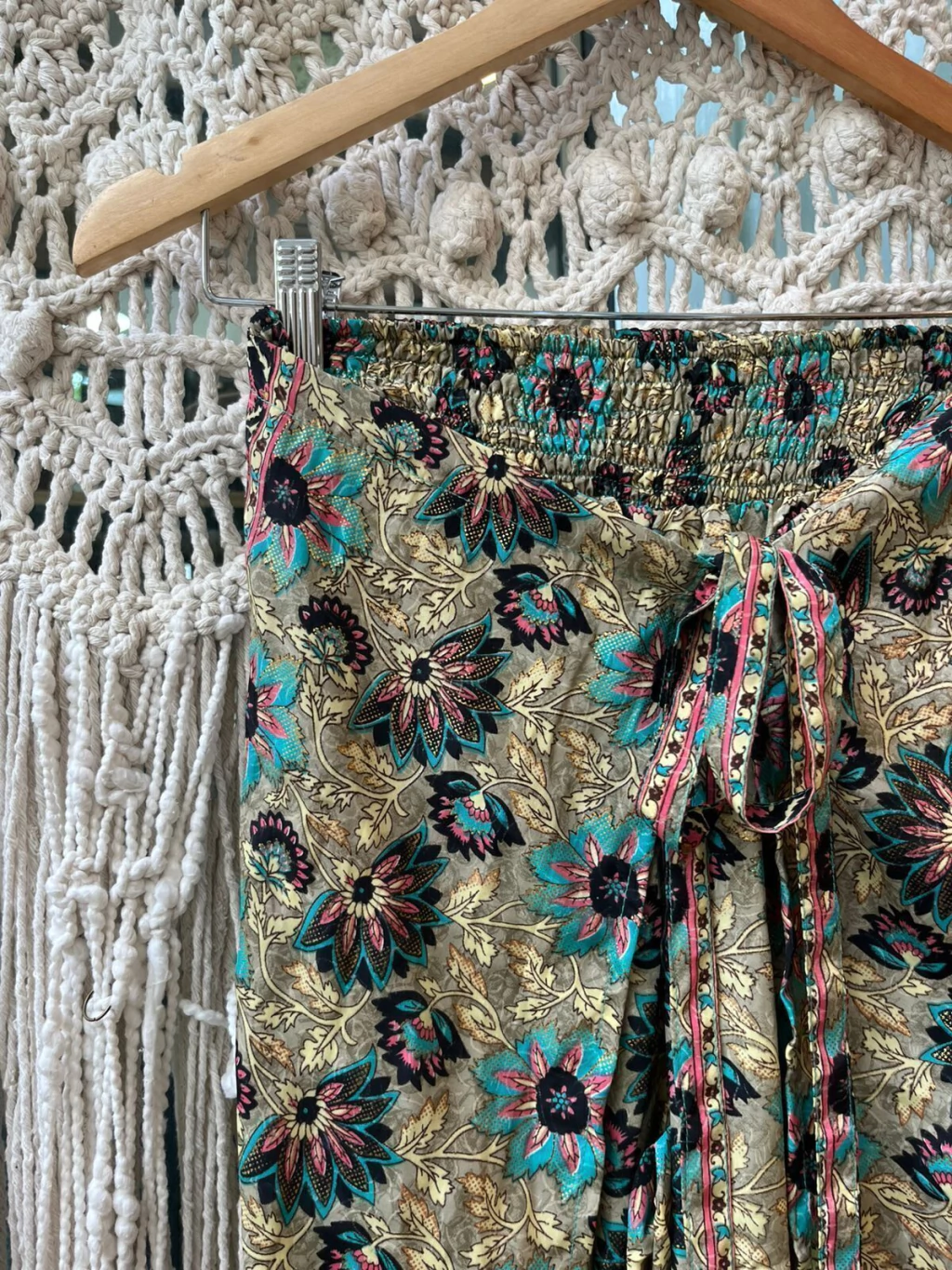 Descubre la magia y la elegancia con nuestro pantalón "Encantamiento Floral". Confeccionado en exquisita seda de Gold Saree, este pantalón presenta una vibrante combinación de colores intensos, dominados por el rosa y adornados con un encantador estampado floral multicolor. Su diseño de bota ancha ofrece comodidad y estilo, mientras que el sobrepuesto que se ata en la parte delantera crea un efecto de falda que añade un toque único y sofisticado a tu look. Perfecto para cualquier ocasión, este pantalón es la elección ideal para quienes buscan comodidad sin sacrificar elegancia.