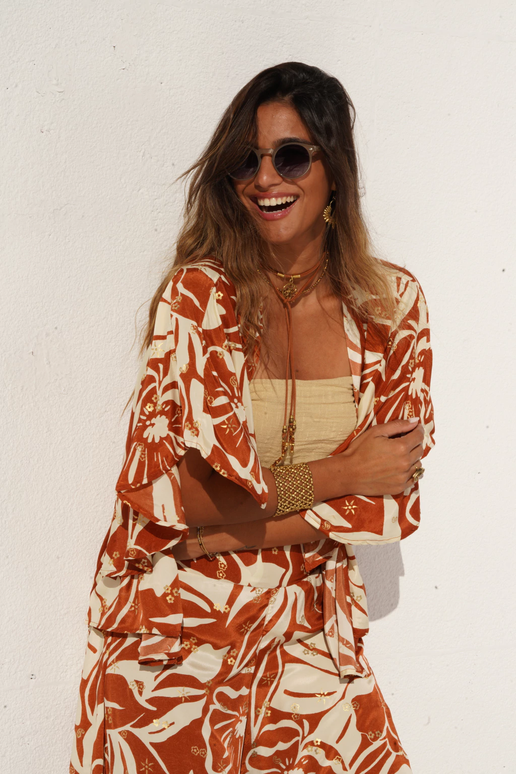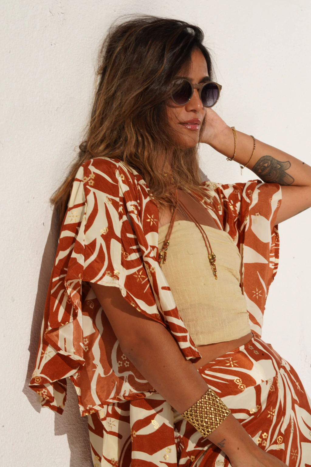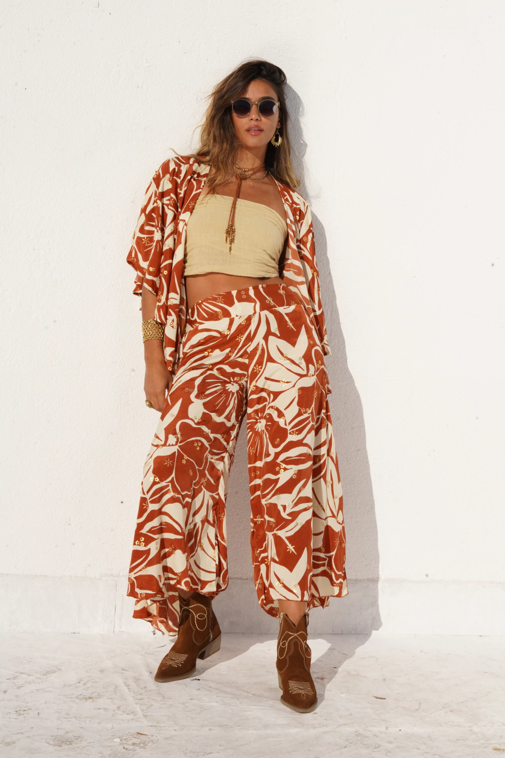 Nuestro Set Antonia posee kimono corto, mangas 3/4 y un sofisticado pantalón ancho. Confeccionado en gold saree. Talle único.