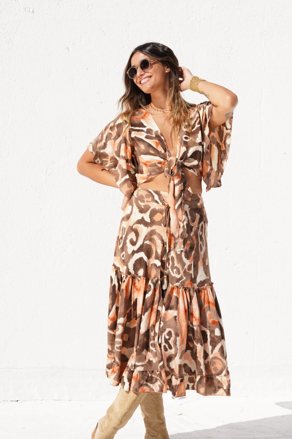 Nuestro Set Ibiza está compuesto por la blusa Ibiza con escote cruzado y manga 3/4, y la falda Ibiza con lazos que se atan en la parte de adelante-. Ambos confeciconados en gold saree y talle único.