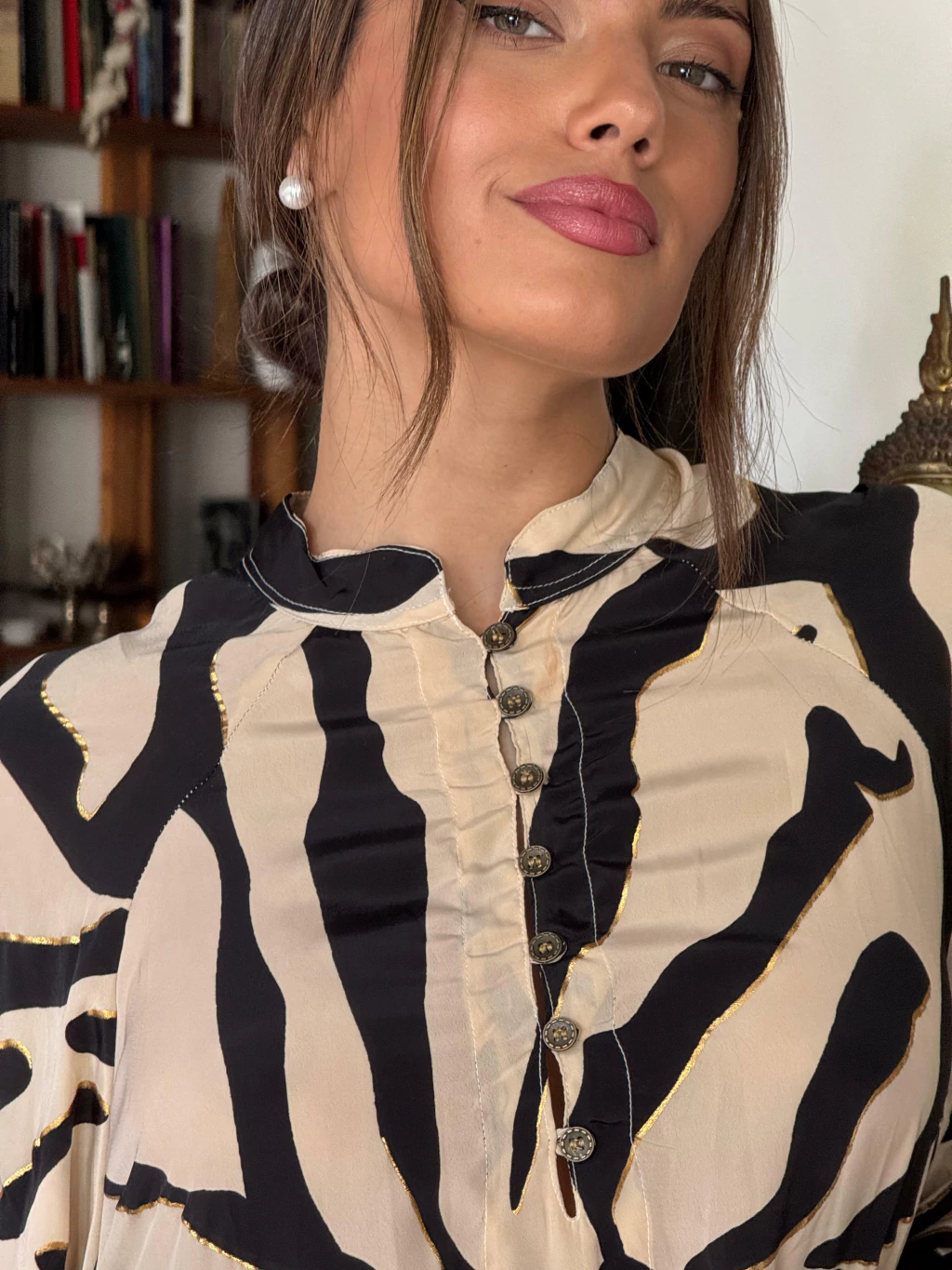 Túnica larga confeccionada en seda goldsaree, mangas largas con una pequeña terminación volante en su muñeca que hacen que la prenda sea única, Su cuello mao , posee botones que hacen que el escote se puedaa usar abierto o cerrado. Disponible en 3 tonos!!.