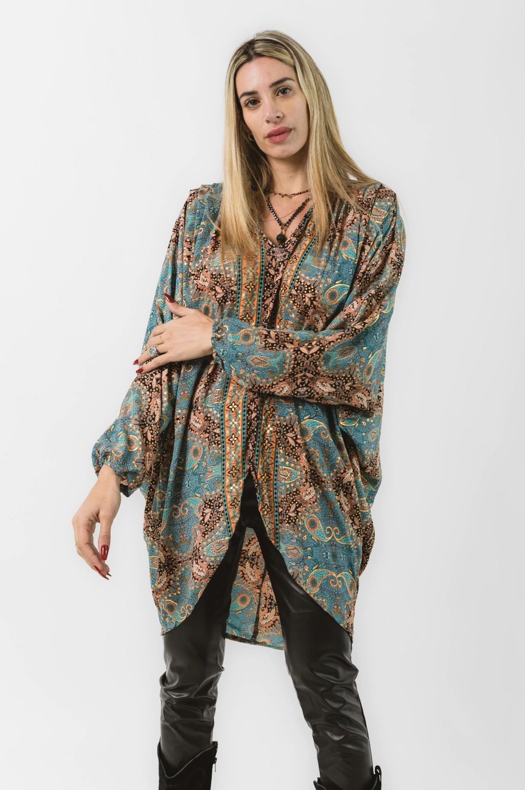 Tunica drapeada de mangas tipo murcielago confeccionada en seda de saree gold.