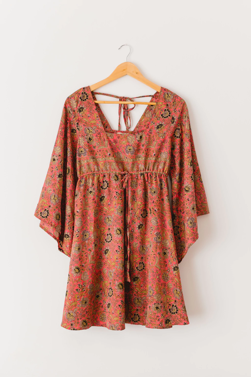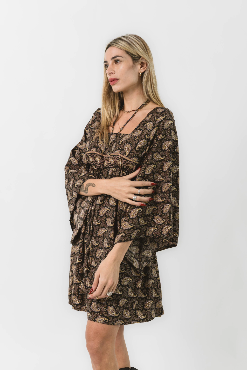Vestido corto confeccionado en saree de corte princesa con escote cuadrado y lazo que ata por delante. Sus mangas son en pico.