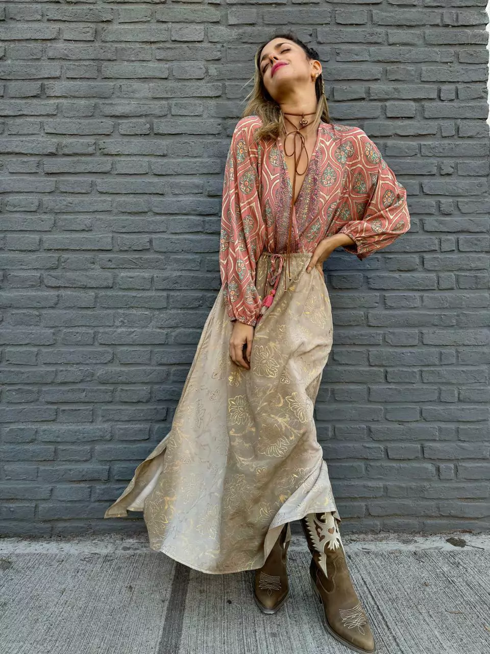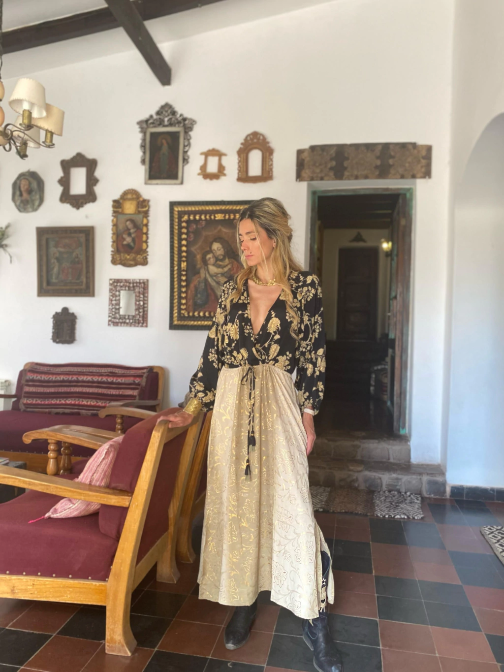 Vestido largo combina gold saree y gold jakart.