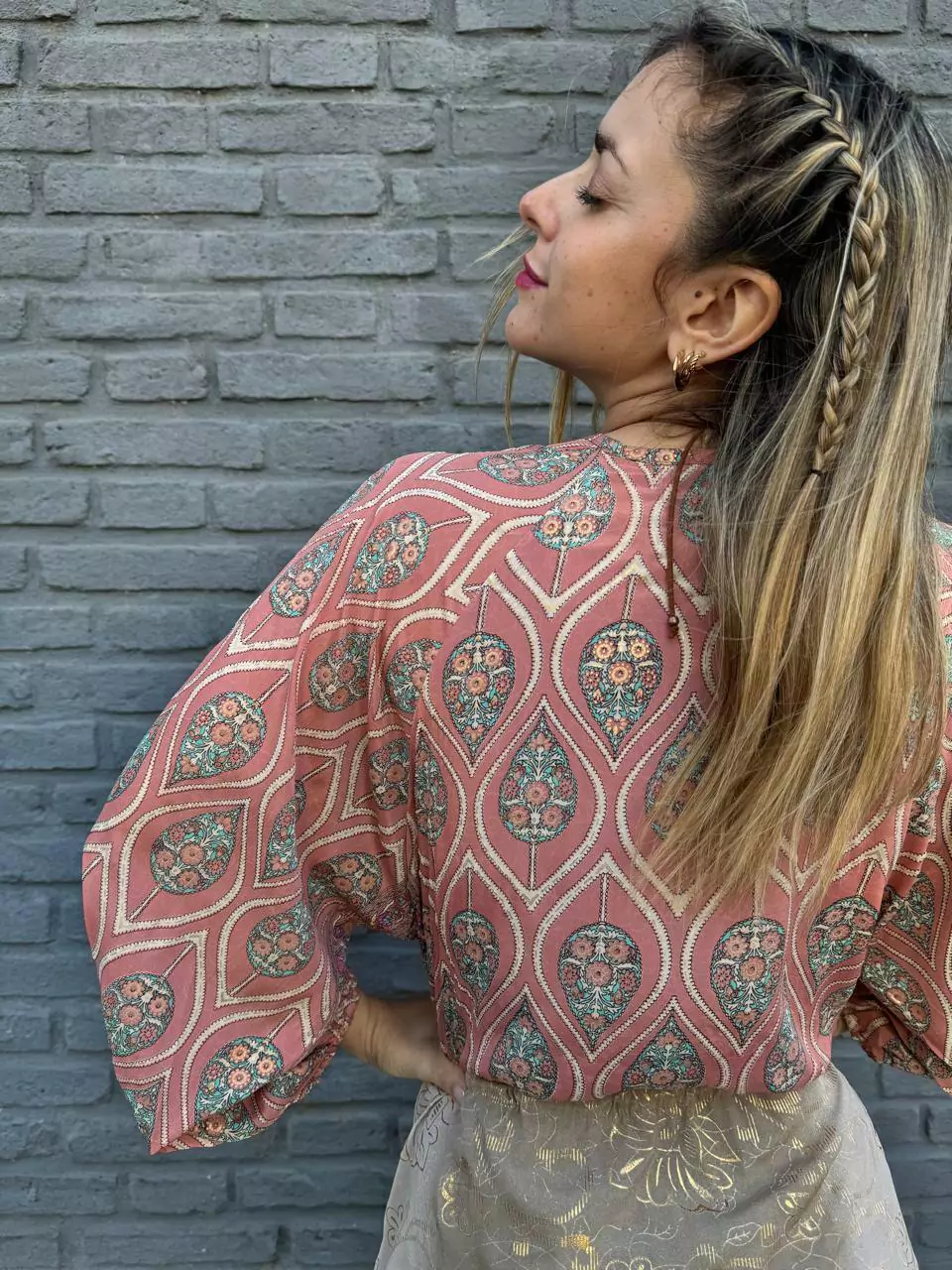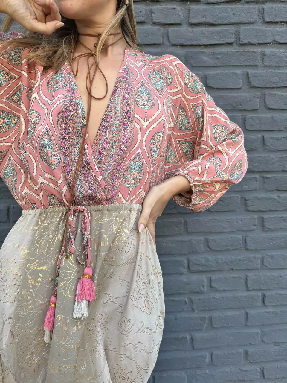 Posee escote cruzado y corte un poco por encima de la cintura con lazo y doble borlas de decoracion.