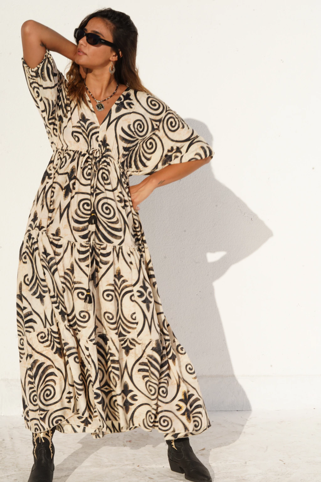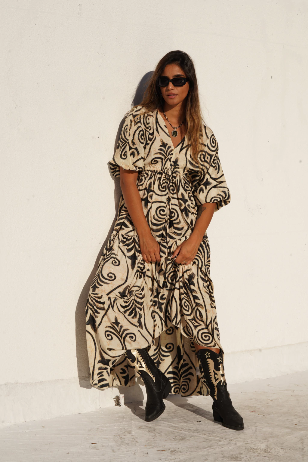 Vestido Julaina largo escote V con espalda descubierta y lazos que se atan en la parte de atrás. Talle único. Confeccionado en gold saree.