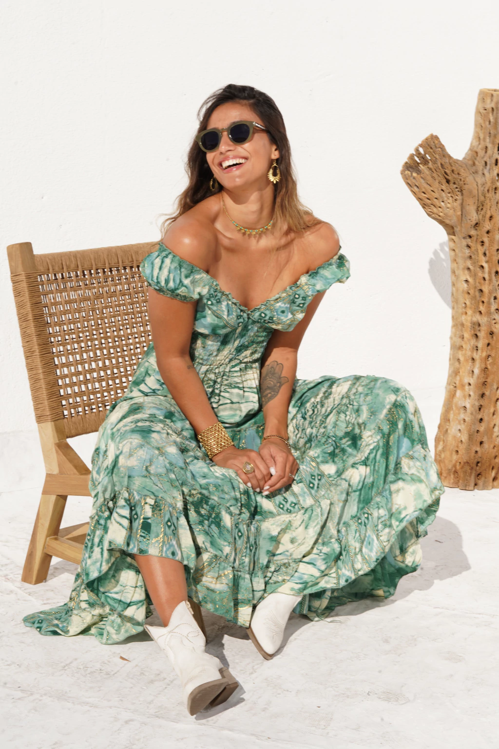 Vestido largo cuello V con mangas, posee elástico en su cintura. Confeccionado en gold saree, talle único.