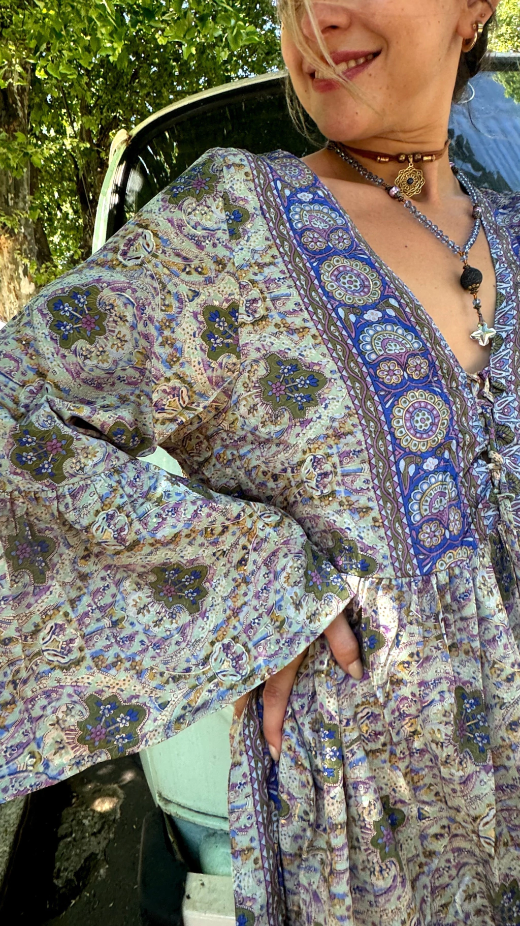 El vestido Solsticio Mágico es una pieza encantadora que combina feminidad y estilo bohemio. Su diseño corto con efecto bolero resalta la silueta con delicadeza, mientras que sus mangas largas y acampanadas añaden un toque de movimiento y elegancia. El detalle del cordón ajustable en el busto permite personalizar el ajuste, aportando versatilidad y comodidad. Este vestido es perfecto para quienes desean lucir frescas, modernas y llenas de magia, ideal tanto para una tarde casual como para un evento especial bajo las estrellas.