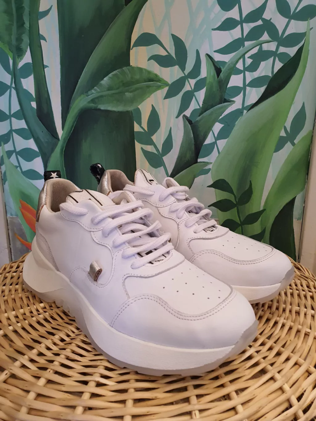 Zapatillas de cuero blancas con detalle plateado en la parte de atrás.